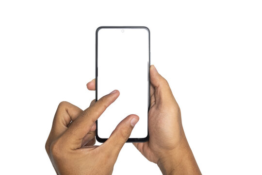 male hand holding and zooming or pinching smartphone with blank screen smartphone. isolated on white background. copy space. transparent png