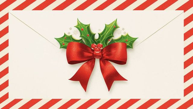 Festive red ribbon and holly adorning cream envelope with candy-cane border, holiday card