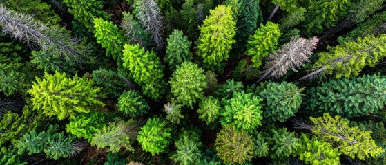 Dense forest canopy seen from above. Lush green pine trees cover the landscape