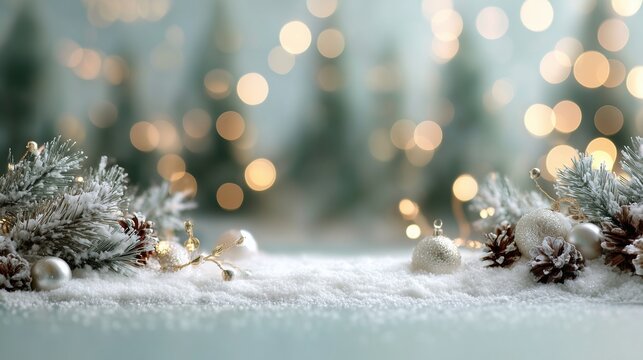 Winter Holiday Theme with Frosted Pine Branches and Pinecone on Sparkling Bokeh Background