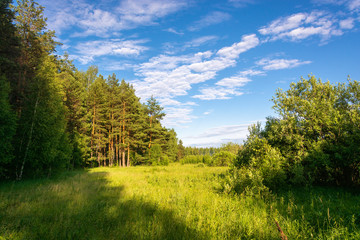 Pine grove in the bright rays of the setting sun and a beautiful cloudy sky.