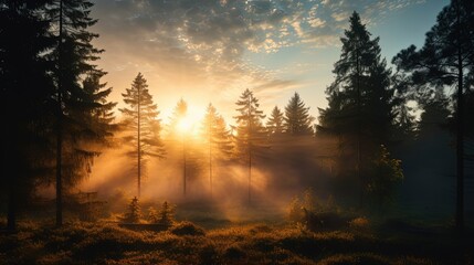 Misty summer morning sun rising in a forest. silhouette concept