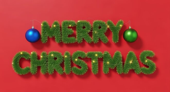 festive christmas greeting with pine needle lettering and baubles on vibrant red background