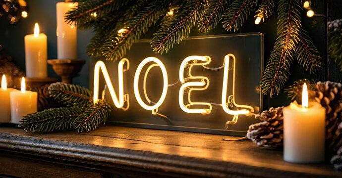 Festive scene. Illuminated NOEL sign, candles, pine branches create cozy winter ambiance. Warm lighting enhances holiday spirit.