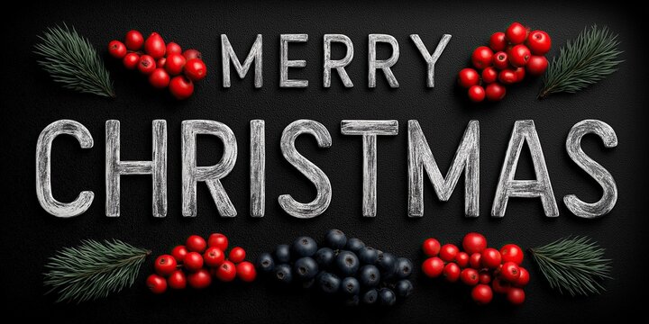 The text Merry Christmas made of silver letters on a black background with dark red and blue berries and pine branches around the lettering