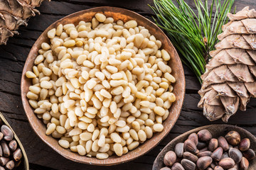 Pine nuts in the bowl and pine nut cones on the wooden table. Organic food. Top view.