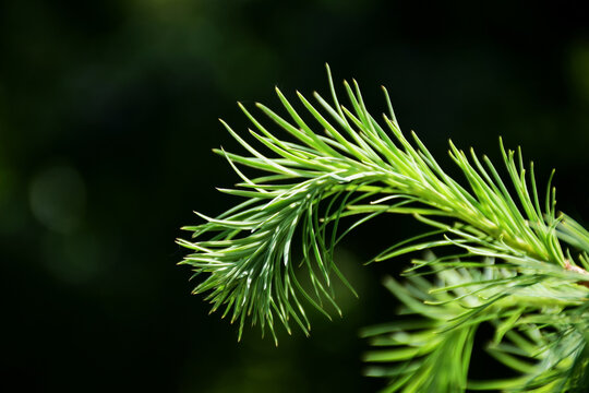 Small lush green pine tree twig or branch. macro view. depicting fresh scent. fine pointy needles. soft blurred background. gardening, and nature concept. lively summer colors. arborvitae.