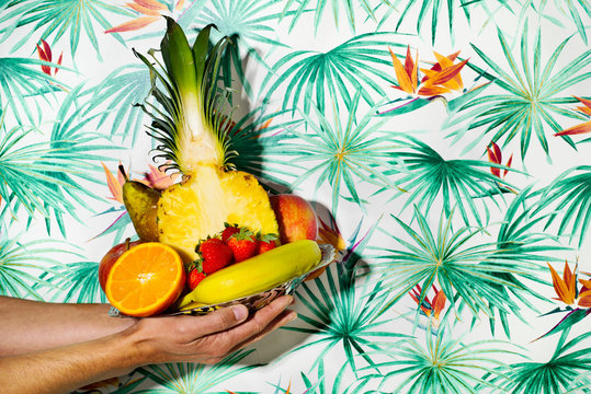 Preparing fresh pineapple with assortment of fruits