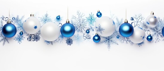 Christmas-themed border with pine cones, snowflakes, and blue ornaments on a white background.