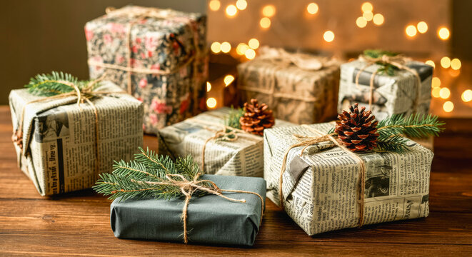 Rustic christmas gift wrapping with natural elements and pinecone accents for seasonal decor