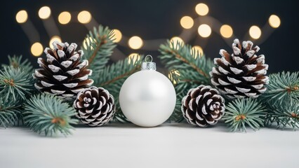 Christmas scene with snow frosted pinecone pine branch and white ornament in warm blurred light