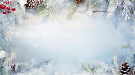 Evergreen boughs adorned with festive pinecones and bright red berries frame a warm, glowing background