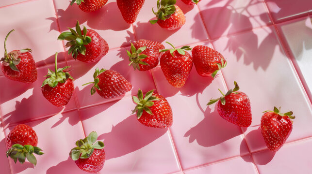 Pink aesthetic background, flatlay strawberries on pink kitchen tiles. Summer food or cosmetic background.