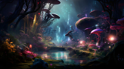Glorious night view of the bioluminescent Pandora Forest with Na'vi creatures, from the movie Avatar