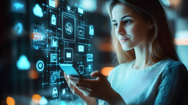 Intense close-up of a young beautiful woman face overlaid with glowing blue and pink digital patterns, representing an AI virtual assistant or an AGI avatar