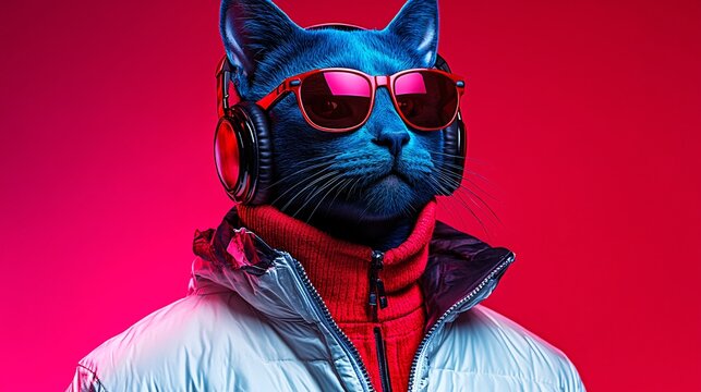 cool cat avatar in stylish winter outfit with sunglasses and headphones on vibrant pink background