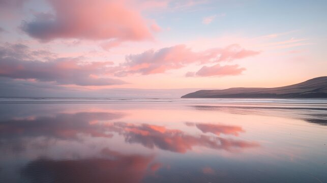 Serene pink sunset over tranquil ocean with cloud reflections near coastal hills