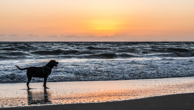 Side view of a black labrador mix with a harness on standing on the beach watching the sun rise.