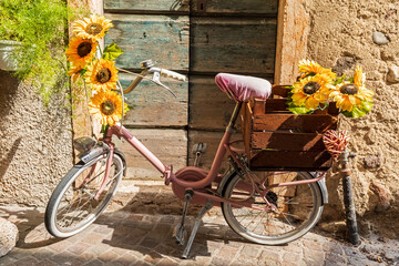 Flowers fly out from pink bicycle bascet on pink background. Romanitic concept for Valentine day, women or mother day.