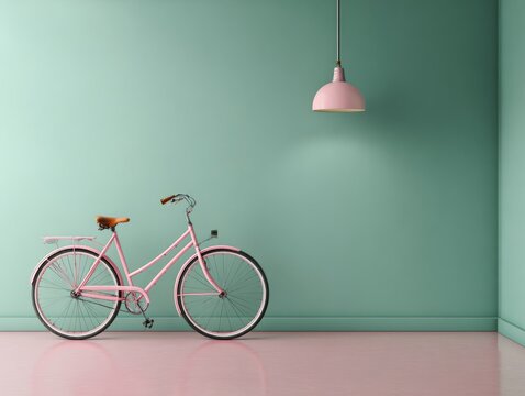 Pink bicycle hanging at the wall in minimal green room