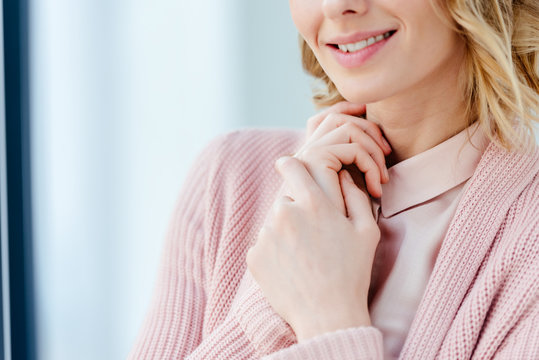 Smiling woman in pink blouse holding smartphone in modern office with greenery. Professional and lifestyle concept for business design
