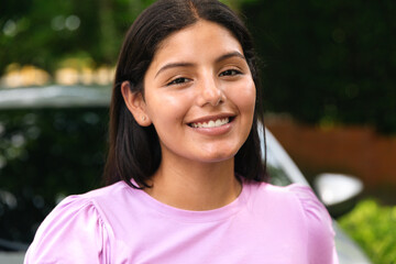 Young woman with long dark wavy hair wearing a pink blouse and light pants, hands in pockets, isolated on transparent background