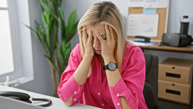 A stressed young woman in a pink blouse feeling headache at the modern office.