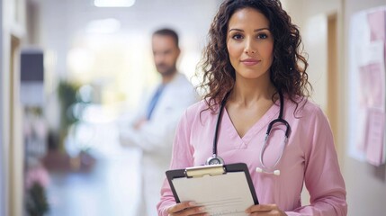 A confident woman standing in a medical clinic holding a clipboard with patient forms wearing a pink blouse and a stethoscope around her neck representing the role of healthcare professionals in