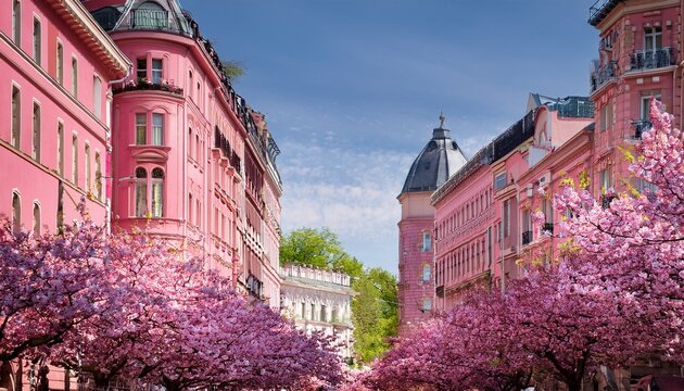 Old European street with pink buildings and flowering plants