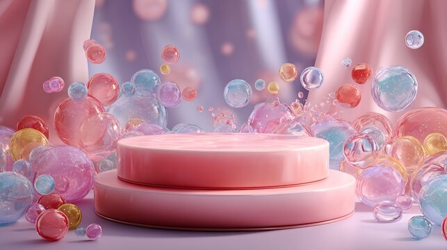 A soft pink cosmetic display podium surrounded by pastel colored floating soap bubbles against a draped satin background.
