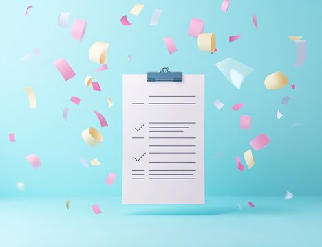 Blank checklist, surrounded by confetti, on pastel teal background