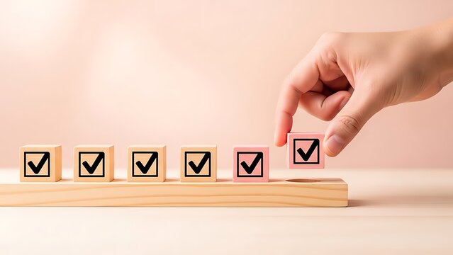 Hand placing a pink wooden block with a checkmark onto a wooden base completing a task list