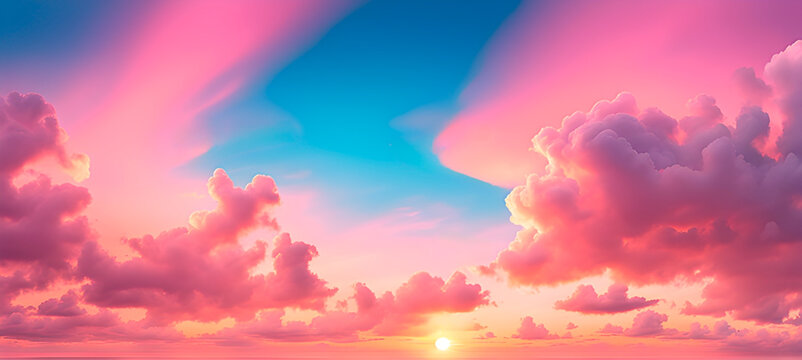 A stunning sunset in a whimsical world, where pink clouds weave a dreamlike tapestry of colors and charm.