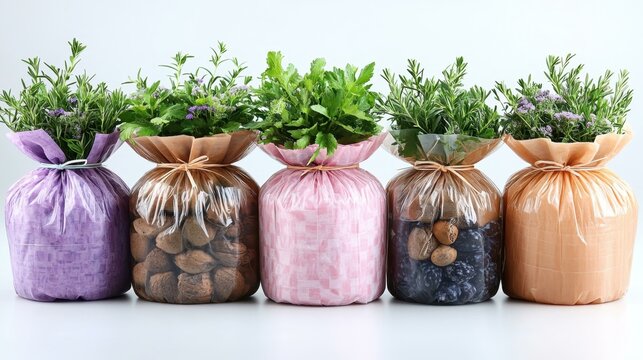 Coin Pouches. Five fabric bags with coins, pastel colors, savings and