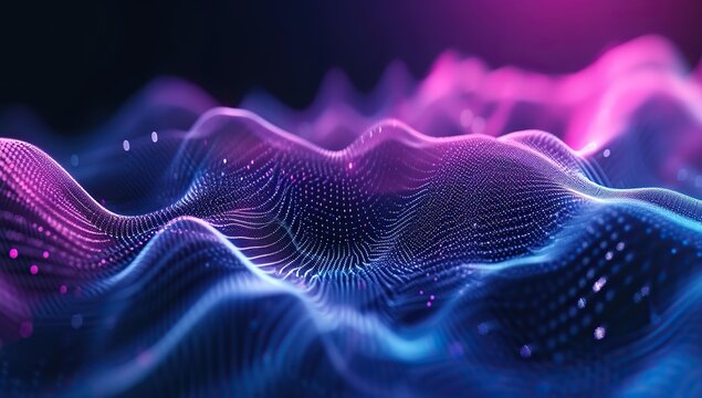 Abstract digital wave pattern with glowing pink and blue dots on a dark background