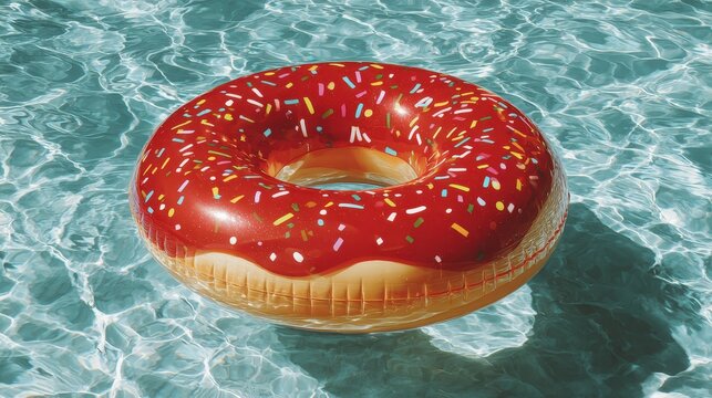 Inflatable donut pool float with pink frosting and colorful sprinkles sits on a pink surface, summer fun