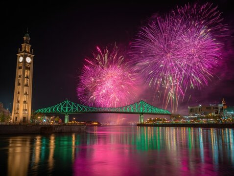 Spectacular fireworks illuminate the night sky over a grand historic landmark and city skyline with reflections in water