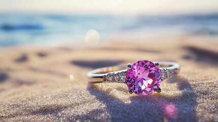 pink gemstone ring on soft fabric background
