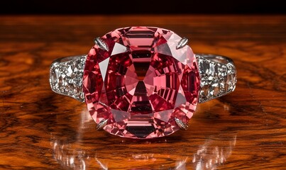 Pink spinel gemstone ring with diamonds on a wooden surface.