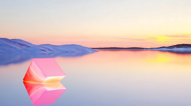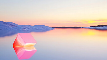 serene landscape featuring glowing pink geometric shape reflecting on calm water at sunset