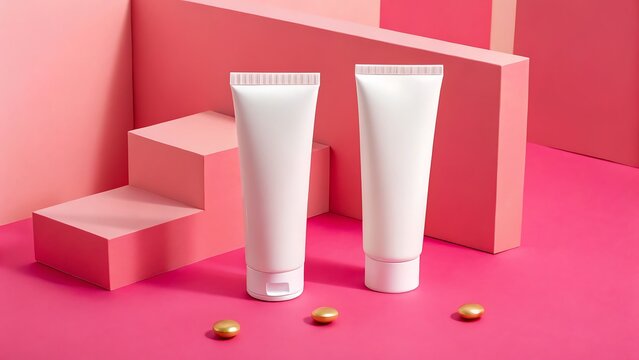 Two white cosmetic tubes with pink geometric background and pearls