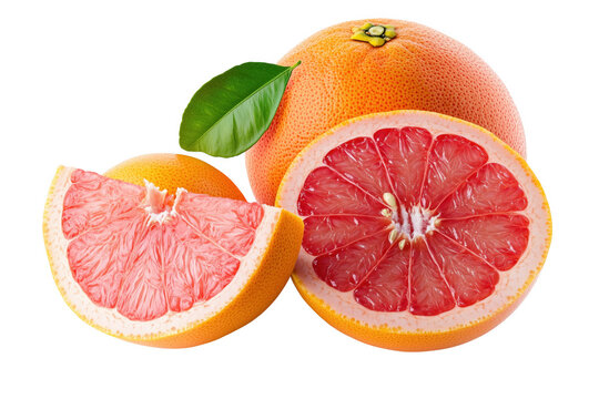 Pink grapefruit and cut in a half and in a slice isolated over transparent background.