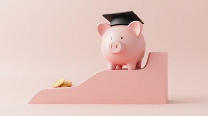 piggy bank wearing graduation cap sits on pink graph, symbolizing financial growth and education
