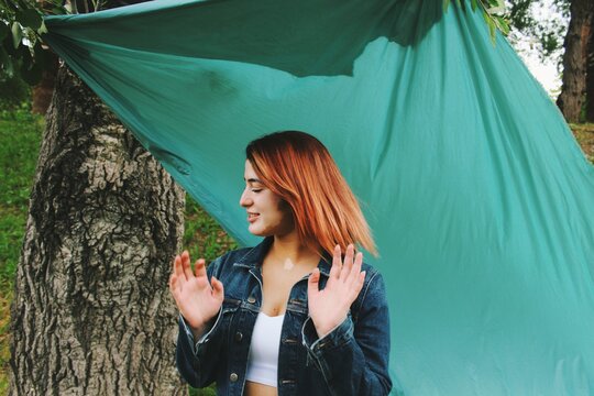 portrait of young woman with pink hairstyle & wind blowing, blue fabric + natural background