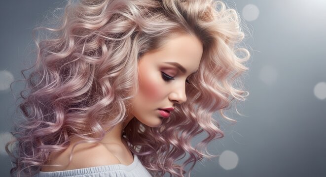 Colored Ombre bob hair extensions. Beauty Blonde Model Girl with short pink hairstyle isolated on gray background. Closeup woman portrait.