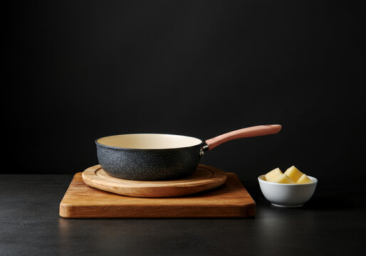 Non-stick frying pan with pink handle on wooden boards next to a bowl of butter