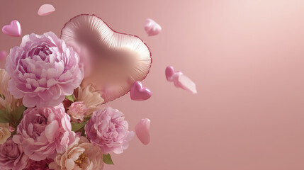 Romantic Valentine's Day background with hearts and pink and red roses on a soft pink gradient, conveying love and affection