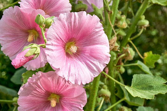 Closeup of blooming pink hollyhock flowers against a background with green leaves in summer.