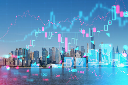 Neon holographic data network displaying candlestick and line charts with connected nodes