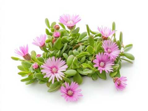Delicate pink ice plant flowers with green leaves against a white background